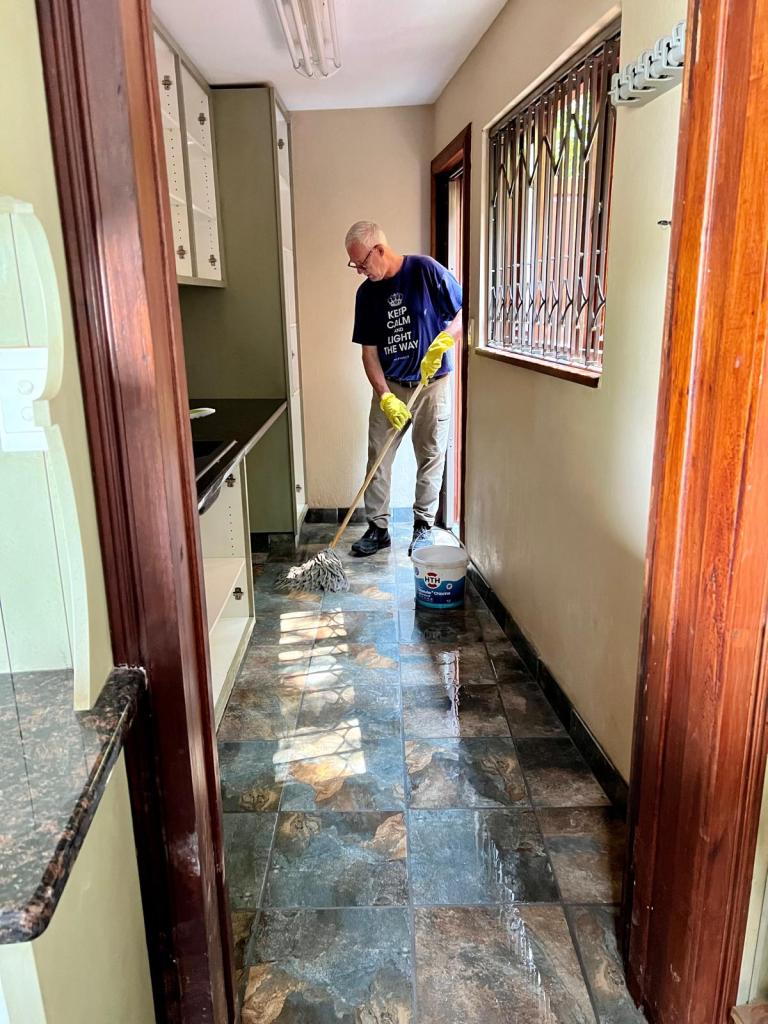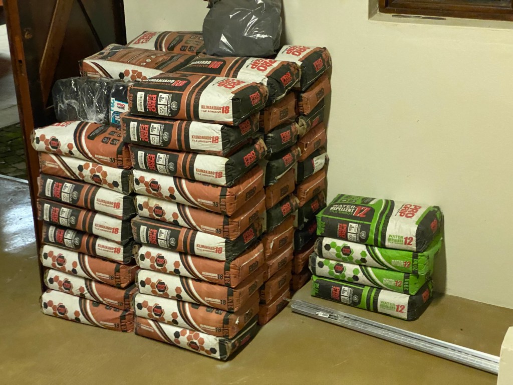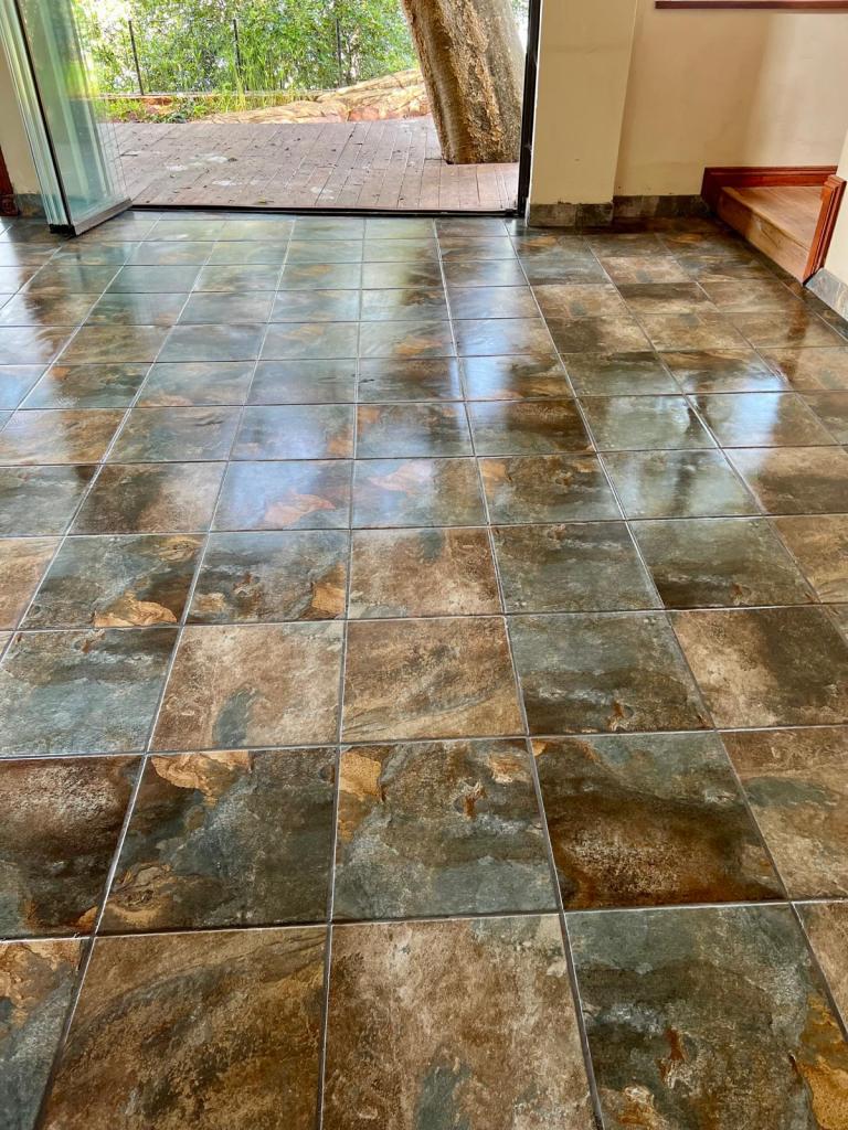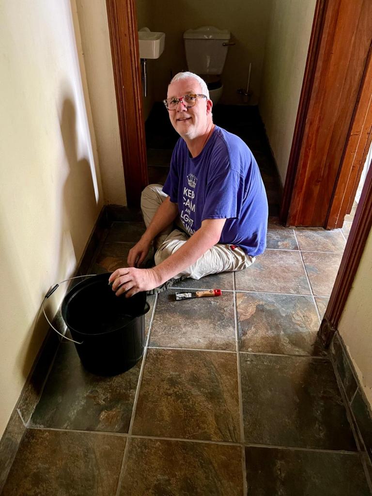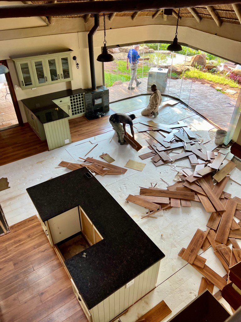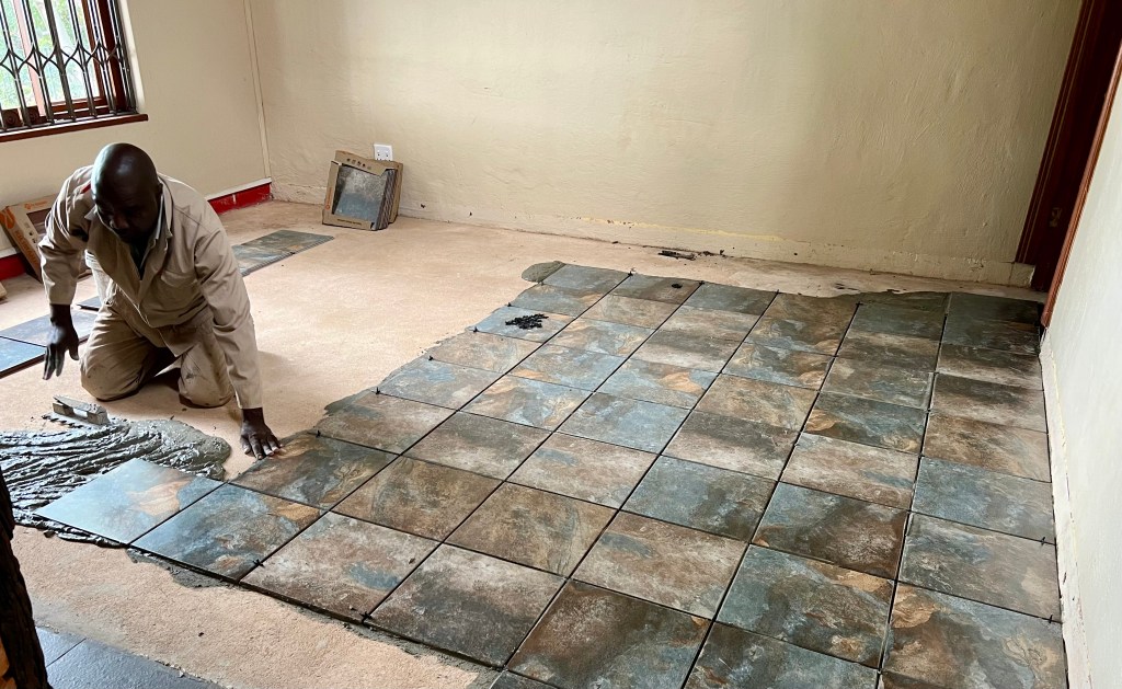 We’re really thrilled with the tiles. What was a tacky vinyl wood floor is now slate-like tiles, made right here in South Africa! Edwin did an amazing job of finding the one straight wall in the house and then following that line from one end of the property to the other.